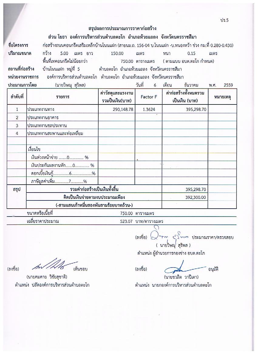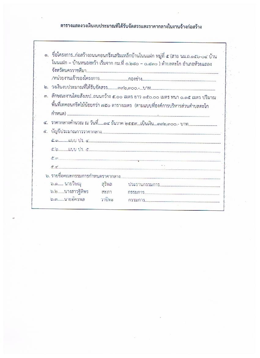 ประกาศราคากลางโครงการก่อสร้างถนนคอนกรีตเสริมเหล็กบ้านโนนแฝก หมู่ที่ 5