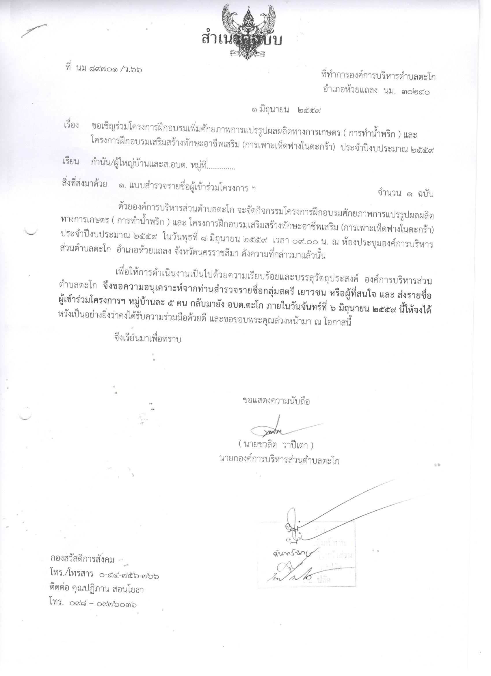 ขอเชิญร่วมโครงการฝึกอบรมเพิ่มสักยภาพฯและโคงรการฝึกอบรมเสริมสร้างทักษะอาชีพเสริม (การเพาะเห็ดฟางในตะกร้า) ประจำปีงบประมาณ 2559