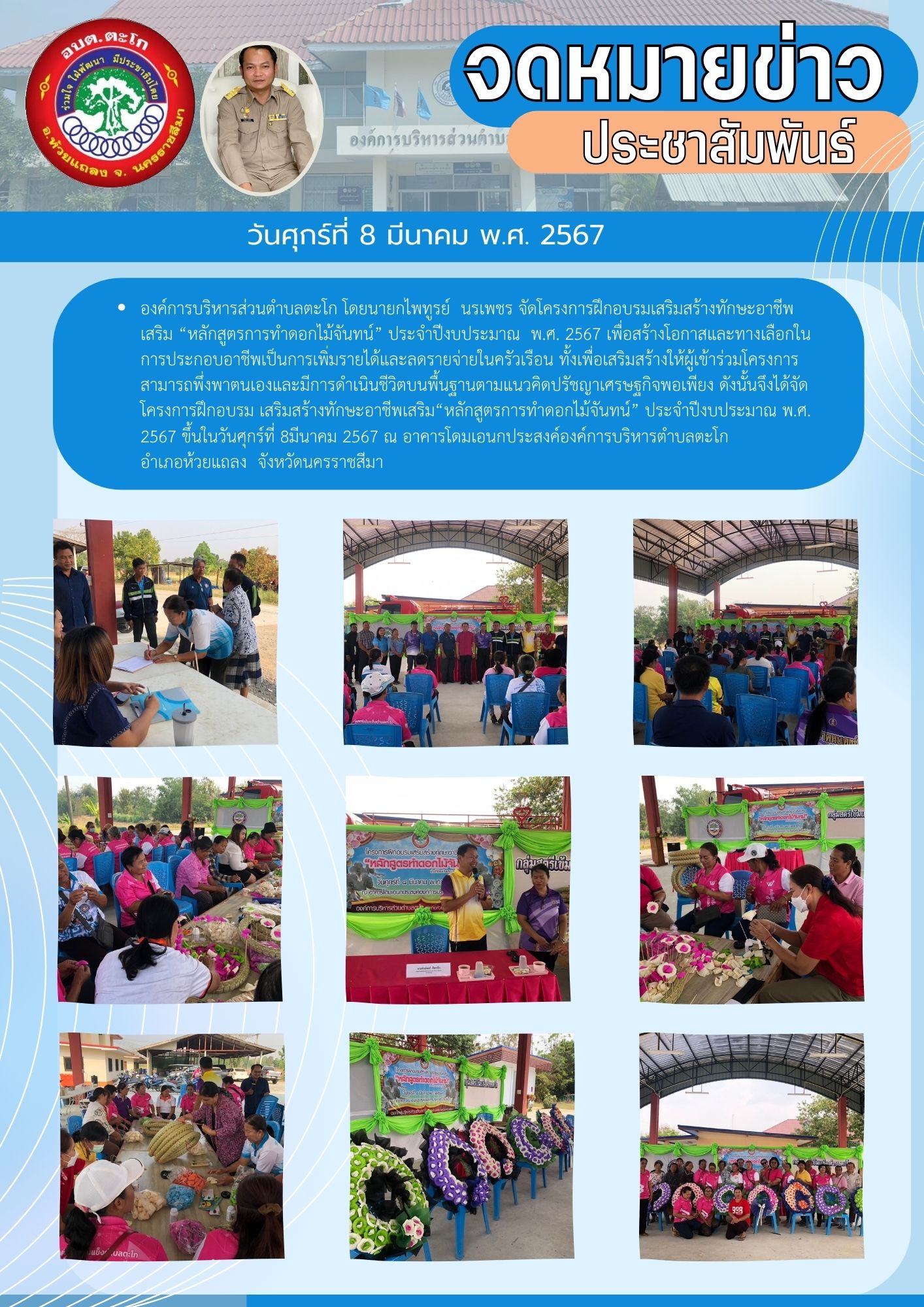 องค์การบริหารส่วนตำบลตะโก โดยนายกไพทูรย์ นรเพชร จัดโครงการฝึกอบรมเสริมสร้างทักษะอาชีพเสริม “หลักสูตรการทำดอกไม้จันทน์” ประจำปีงบประมาณ พ.ศ. 2567 เพื่อสร้างโอกาสและทางเลือกในการประกอบอาชีพเป็นการเพิ่มรายได้และลดรายจ่ายในครัวเรือน ทั้งเพื่อเสริมสร้างให้ผู้เข้าร่วมโครงการสามารถพึ่งพาตนเองและมีการดำเนินชีวิตบนพื้นฐานตามแนวคิดปรัชญาเศรษฐกิจพอเพียง ดังนั้นจึงได้จัดโครงการฝึกอบรม เสริมสร้างทักษะอาชีพเสริม“หลักสูตรการทำดอกไม้จันทน์” ประจำปีงบประมาณ พ.ศ. 2567 ขึ้นในวันศุกร์ที่ 8มีนาคม 2567 ณ อาคารโดมเอนกประสงค์องค์การบริหารตำบลตะโก อำเภอห้วยแถลง จังหวัดนครราชสีมา
