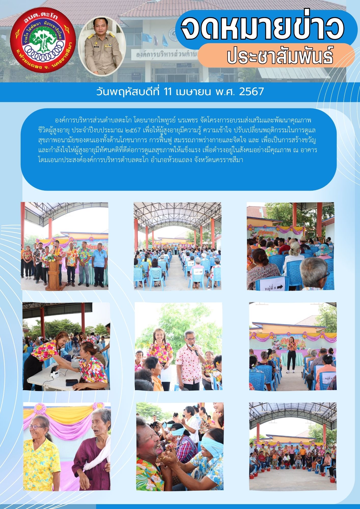 องค์การบริหารส่วนตำบลตะโก โดยนายกไพทูรย์ นรเพชร จัดโครงการอบรมส่งเสริมและพัฒนาคุณภาพชีวิตผู้สูงอายุ ประจำปีงบประมาณ ๒๕67 เพื่อให้ผู้สูงอายุมีความรู้ ความเข้าใจ ปรับเปลี่ยนพฤติกรรมในการดูแลสุขภาพอนามัยของตนเองทั้งด้านโภชนาการ การฟื้นฟู สมรรถภาพร่างกายและจิตใจ และ เพื่อเป็นการสร้างขวัญ และกำลังใจให่ผู้สูงอายุมีทัศนคติที่ดีต่อการดูแลสุขภาพให้แข็งแรง เพื่อดำรงอยู่ในสังคมอย่างมีคุณภาพ ณ อาคารโดมเอนกประสงค์องค์การบริหารตำบลตะโก อำเภอห้วยแถลง จังหวัดนครราชสีมา